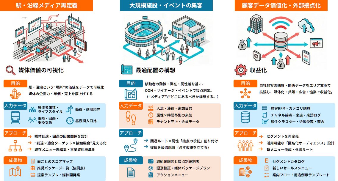 エリアデータを活用して場所価値を可視化し収益化する仕組みをつくるご支援も致します。
