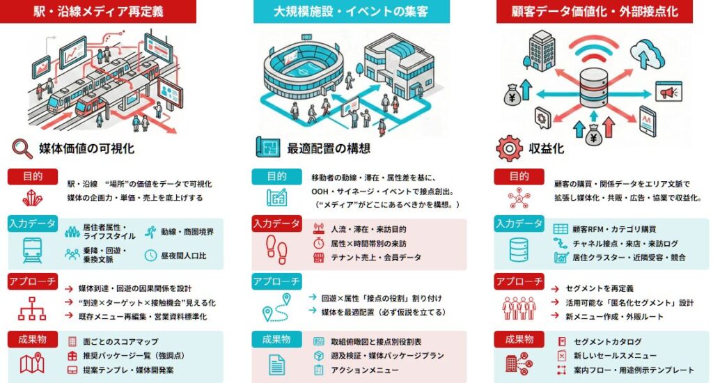 鷹野:鉄道会社様は当然、沿線について深い理解をお持ちですが、そこに「ライフスタイル」という視点を加えることで、媒体の価値を再定義できます。たとえば「この駅は学生が多い」という定説に対し、データで「実は週末に特定の商業施設へ向かう若年層ファミリーも多い」といった新たな事実を示すことができます。これまで見過ごされていた価値をフラットに分析・提示することで、新たな広告主へのアプローチが可能になるのです。