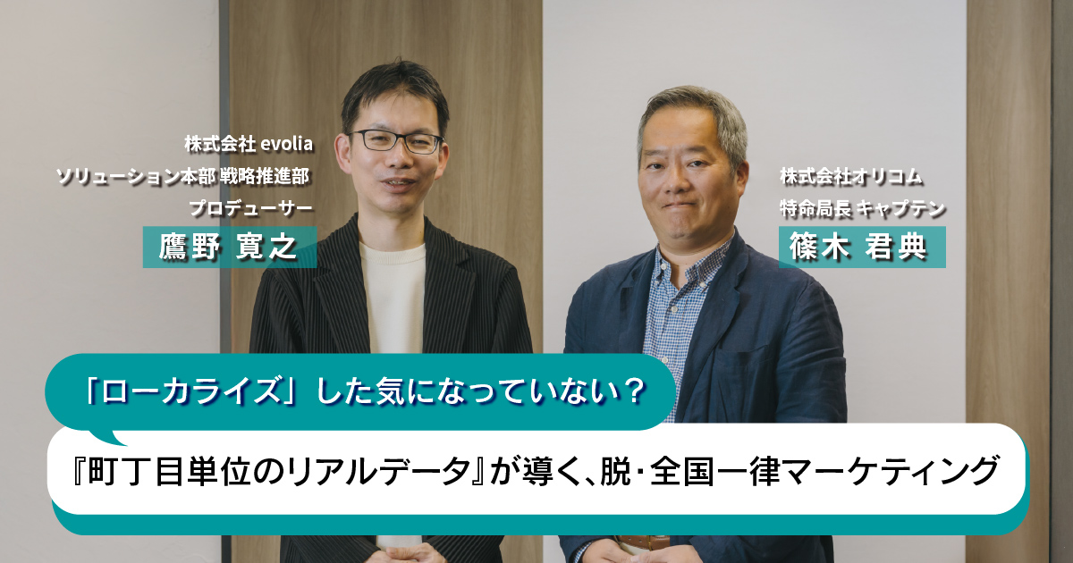 「東京で成功したキャンペーンの施策が、地方ではまったく成果が上がっていない」「全国一律のキャンペーンなのに、特定のエリアだけ無風」。その原因は、マーケターがモニター越しに見ている「平均的な顧客像」と、地域の「リアルな生活者」との間に致命的なズレがあるからかもしれない。オリコムが提唱する『ローカルデータドリブン設計』は、このズレをデータの力で解消するアプローチだ。折込広告由来のデータを活用し、精緻な「町丁目単位」で生活者の実像を可視化、地域の媒体価値をも再定義する独自の手法とは?オリコムグループの特別編成チームを牽引する篠木氏と、データ分析を担う鷹野氏への取材を通して、画一的なアプローチでは見えてこない「エリアマーケティングの正解」を探る。